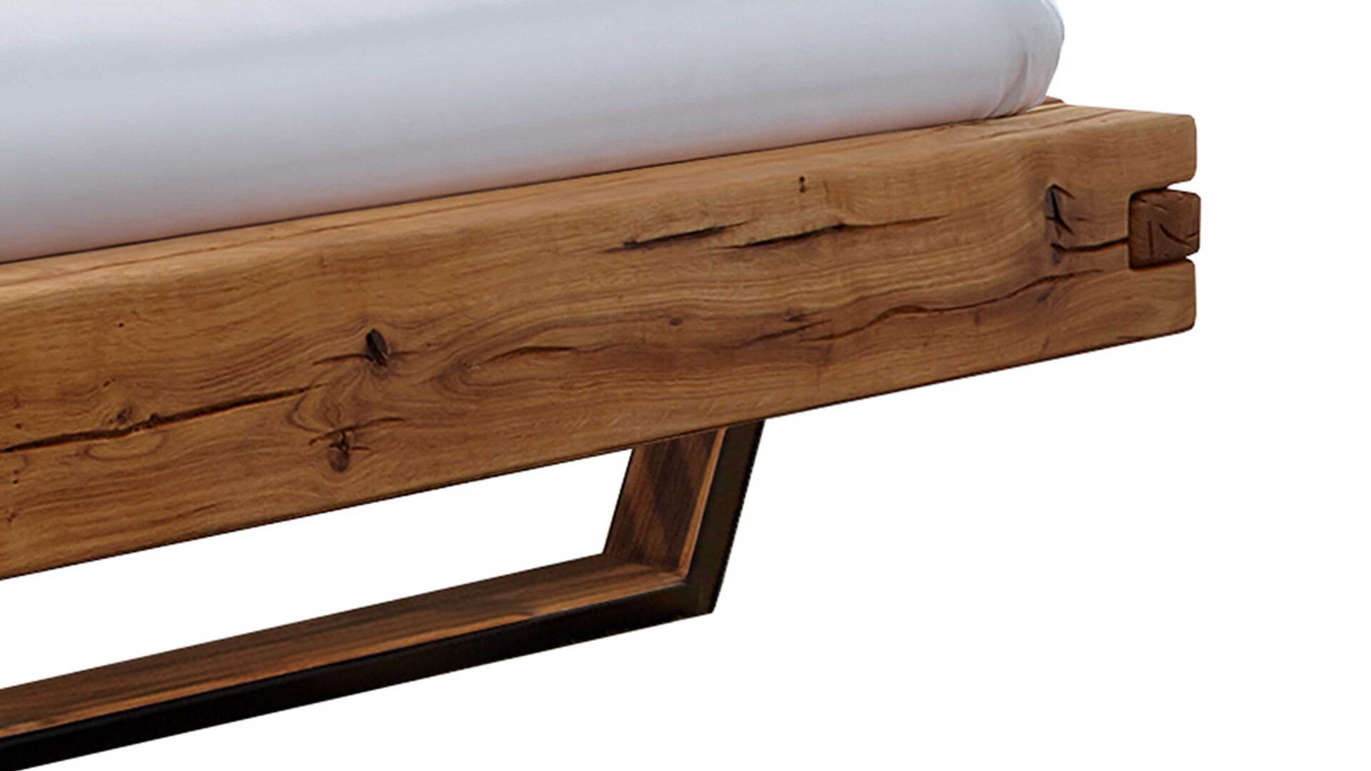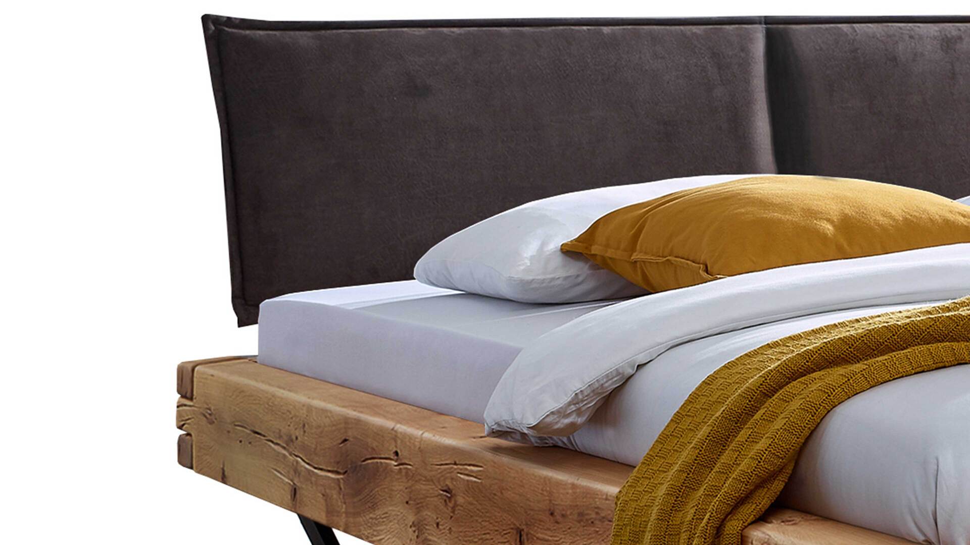 Hergestellt aus massiver geölter Wildeiche, grauem Stoffbezug und mattschwarzen Metall, bietet dieses Bettgestell eine perfekte Kombination aus natürlicher Schönheit und zeitgemäßem Design. mit einem geteilten Polsterkopfteil mit Keder sorgt das Bett nicht nur für einen komfortablen Rückhalt beim Lesen oder Fernsehen im Bett, sondern verleiht auch dem Raum eine gemütliche Atmosphäre. Die Metallkufen mit Massivholzeinlagen bieten nicht nur eine stabile Basis, sondern setzen auch stilvolle Akzente.