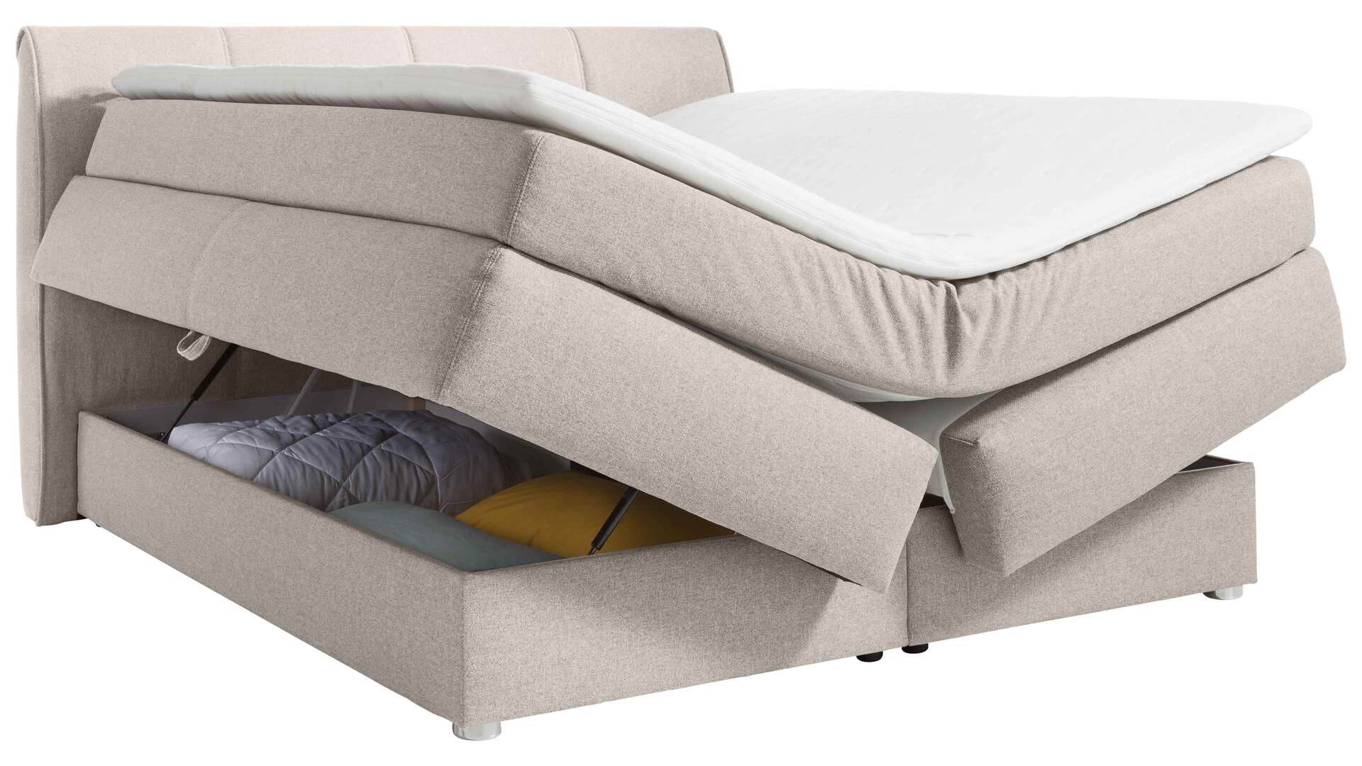 Die Box mit qualitativ hochwertiger Bonnellfederkernpolsterung ist rundum mit dem edlen Flachgewebebezug versehen sowie mit zwei separat seitlich zu öffnenden Bettkästen ausgestattet, die innen weiß beschichtet und belüftet sind.
