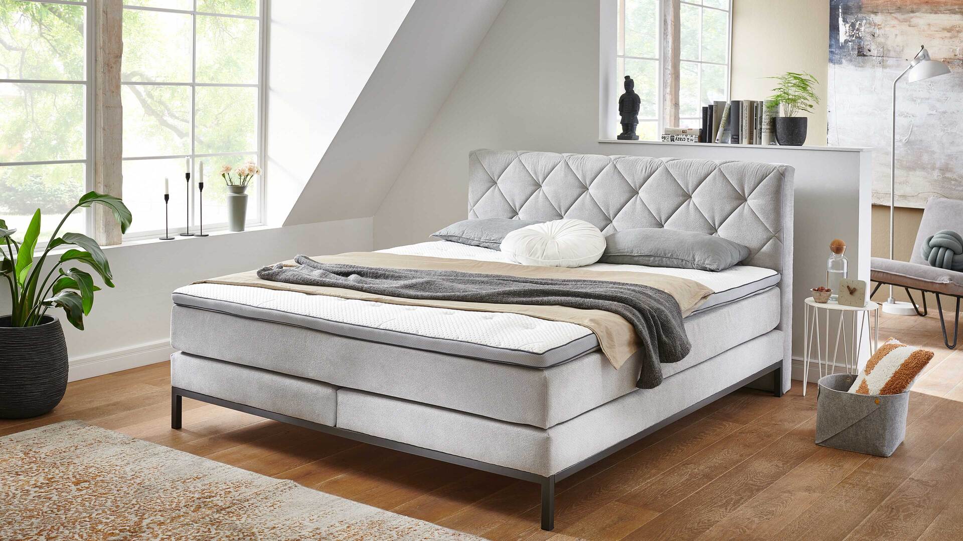 Das hochwertige Boxspringbett Rockaway kombiniert einen silbergrauen Stoffbezug mit einem Fußgestell aus dunkelgrau pulverbeschichtetem Metall. Es strahlt moderne Eleganz aus. Ein optisches Highlight bildet das Polsterkopfteil mit den markanten Heftungen und der Rautensteppung. Die Rückseite ist mit Spinnvlies bezogen.
