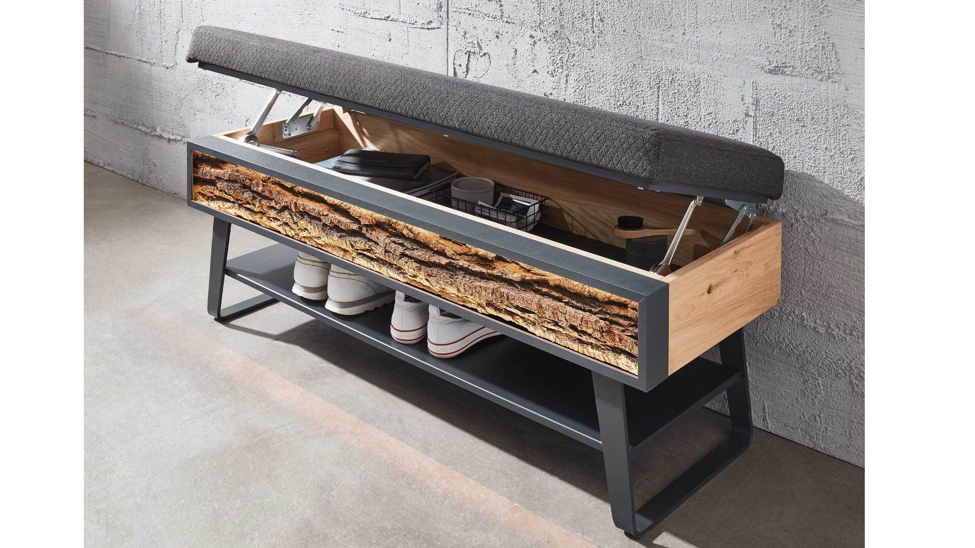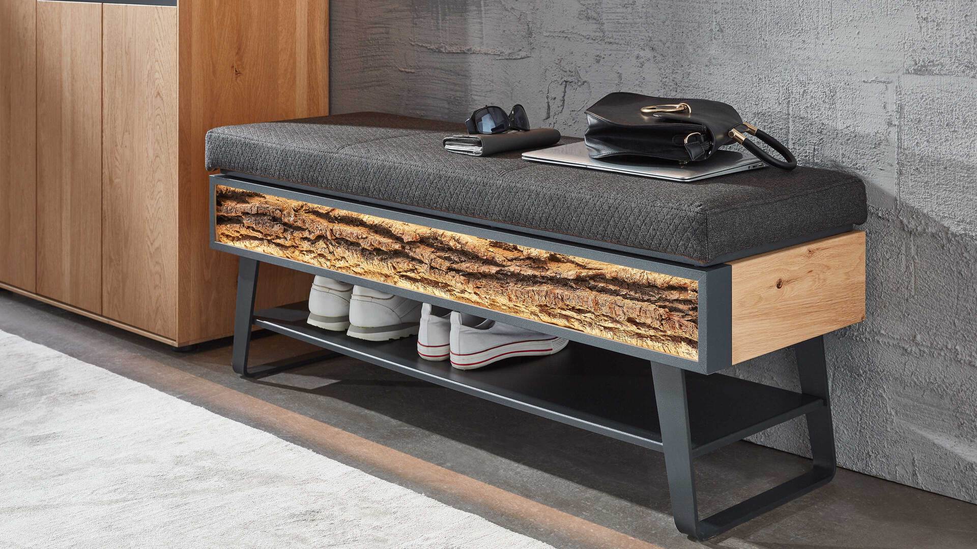 Die Garderobenbank Runa verbindet massive Kerneiche, Rindenholz sowie anthrazitfarbenes Metall und einen ebenfalls anthrazitfarben gestalteten Stoff zu einem robusten, modernen und eindrucksvollen Ganzen.