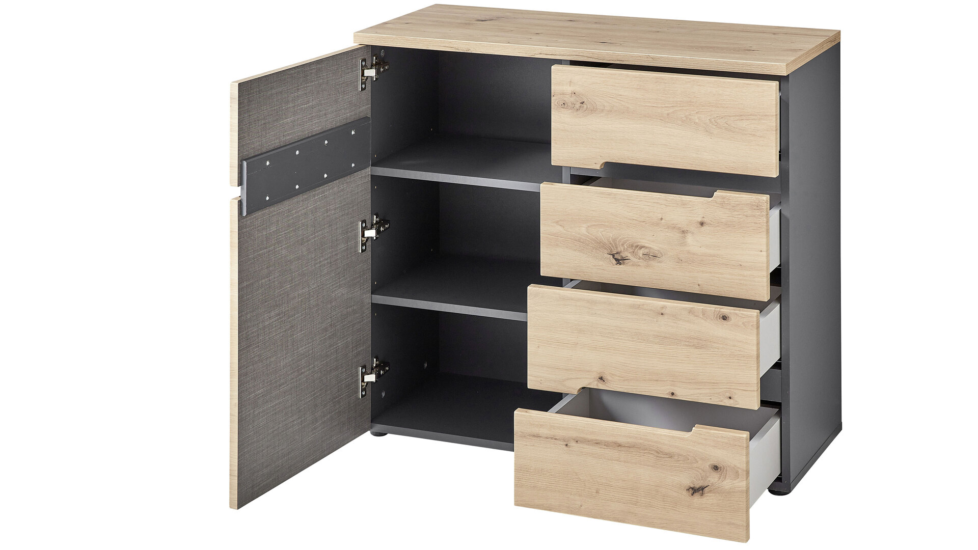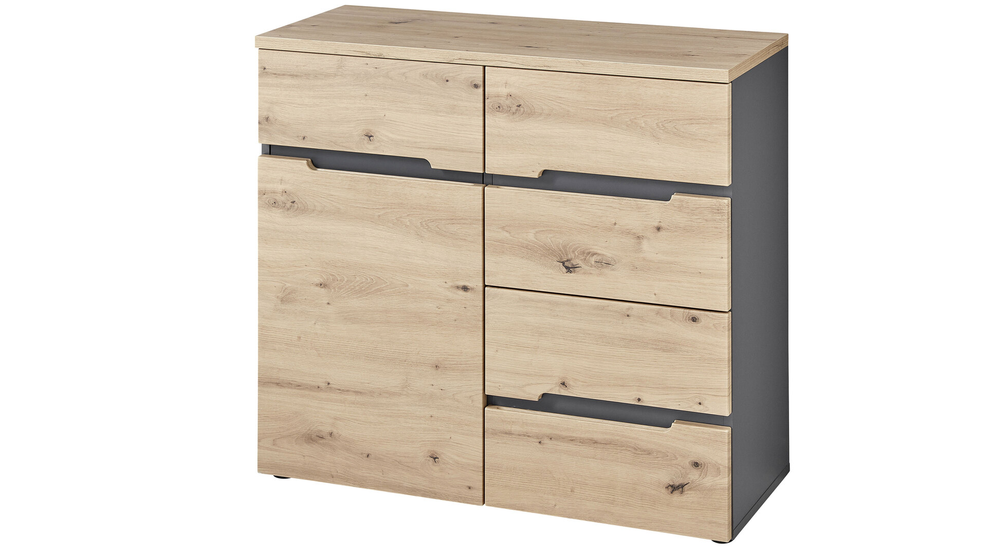 Die Kommode 50 34 GH 25 aus der Kommoden Serie Memphis ist hochwertig verarbeitet und modern-elegant designt. Sie kombiniert authentische Artisan-Eiche-Nachbildung mit Graphit - und damit zwei absolute Trendfarben, die perfekt harmonieren. Ein besonderes Gestaltungsmerkmal des Kommodenschranks bilden die Griffausfräsungen der Fronten.