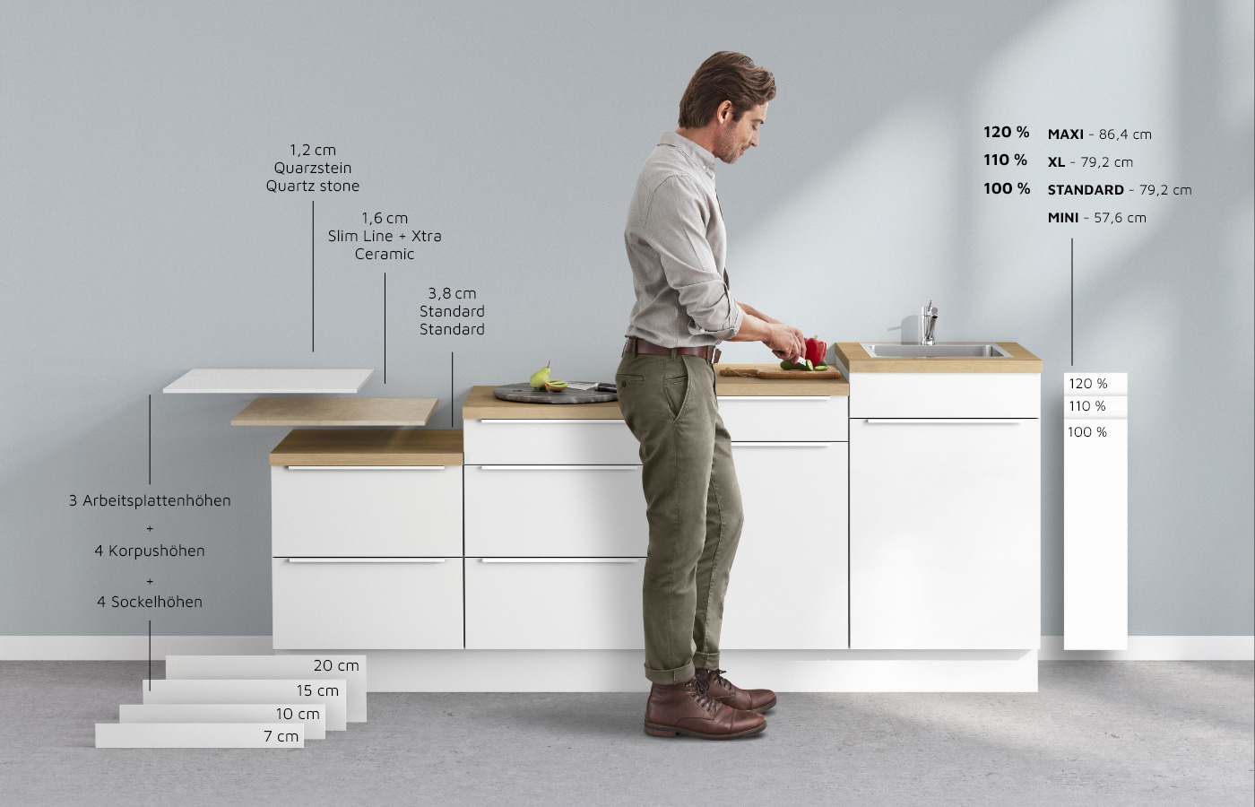 Perfekte Anpassung: Unser Höhensystem ermöglicht individuelle Arbeitshöhen. Vier Korpushöhen, clevere Kombinationen von Unterschränken und Sockelhöhen maximieren den Stauraum, ohne die Arbeitshöhe zu beeinträchtigen. Ergonomische Aktivhöhen für jede Tätigkeit und flexible Feinabstimmung durch vier Sockelhöhen und drei Arbeitsplattenhöhen. Werde jetzt aktiv!