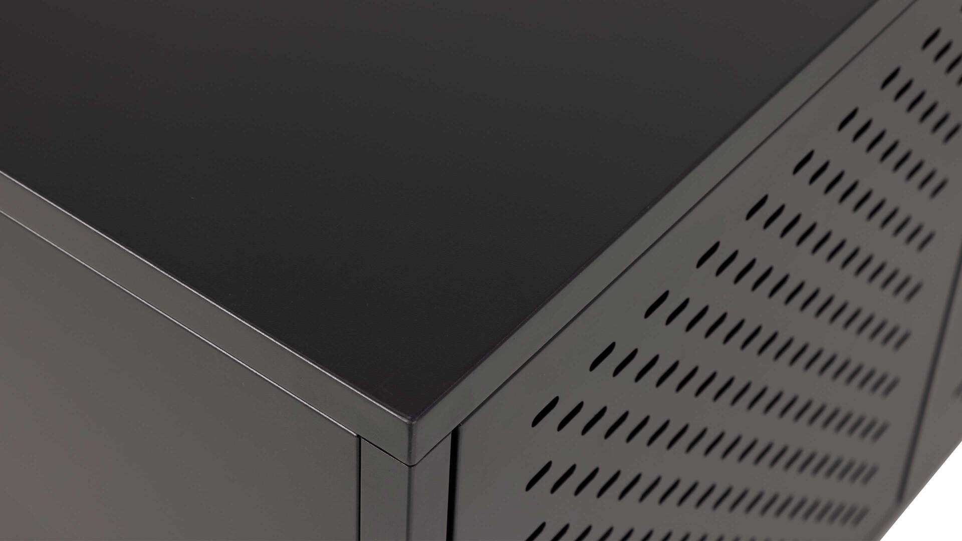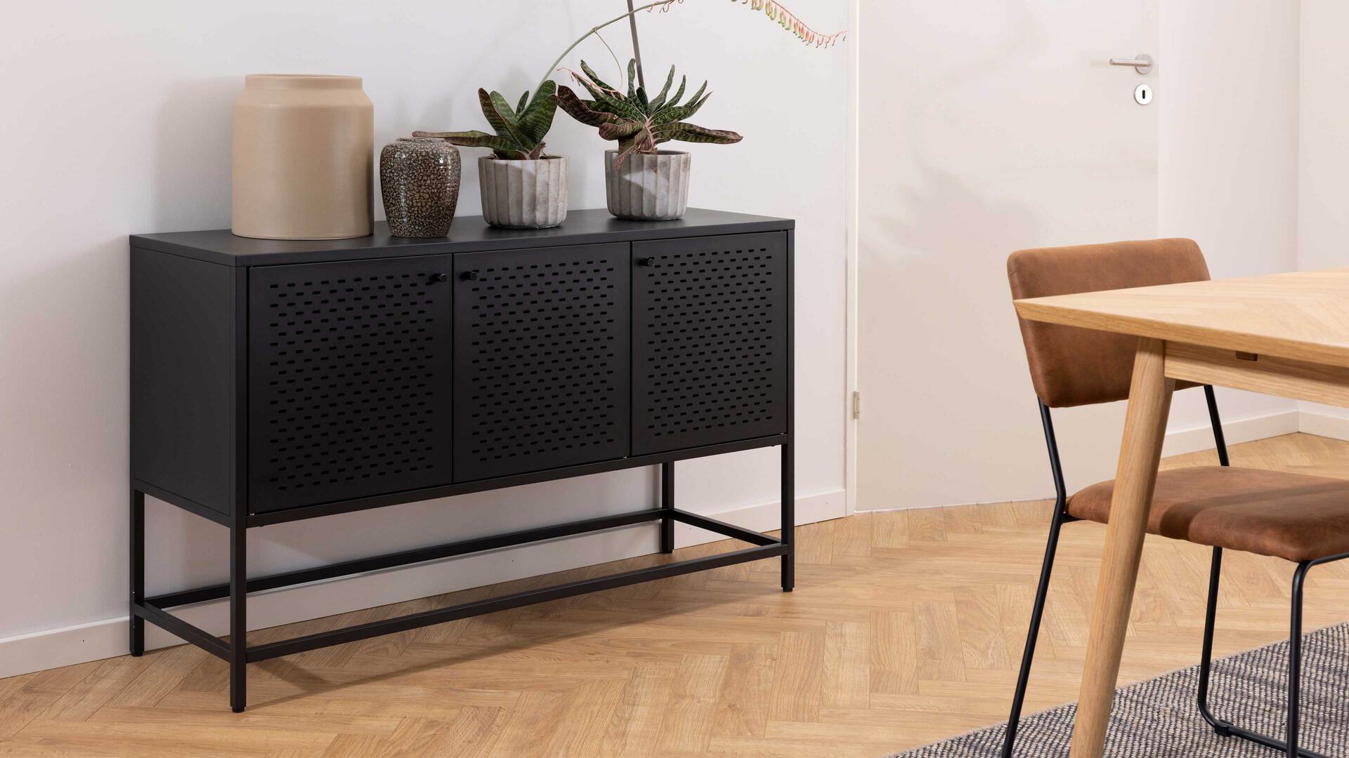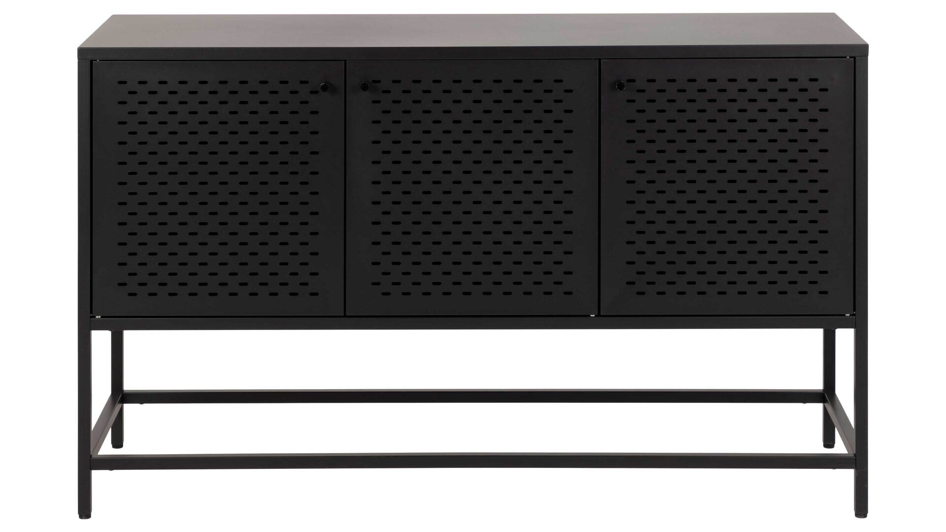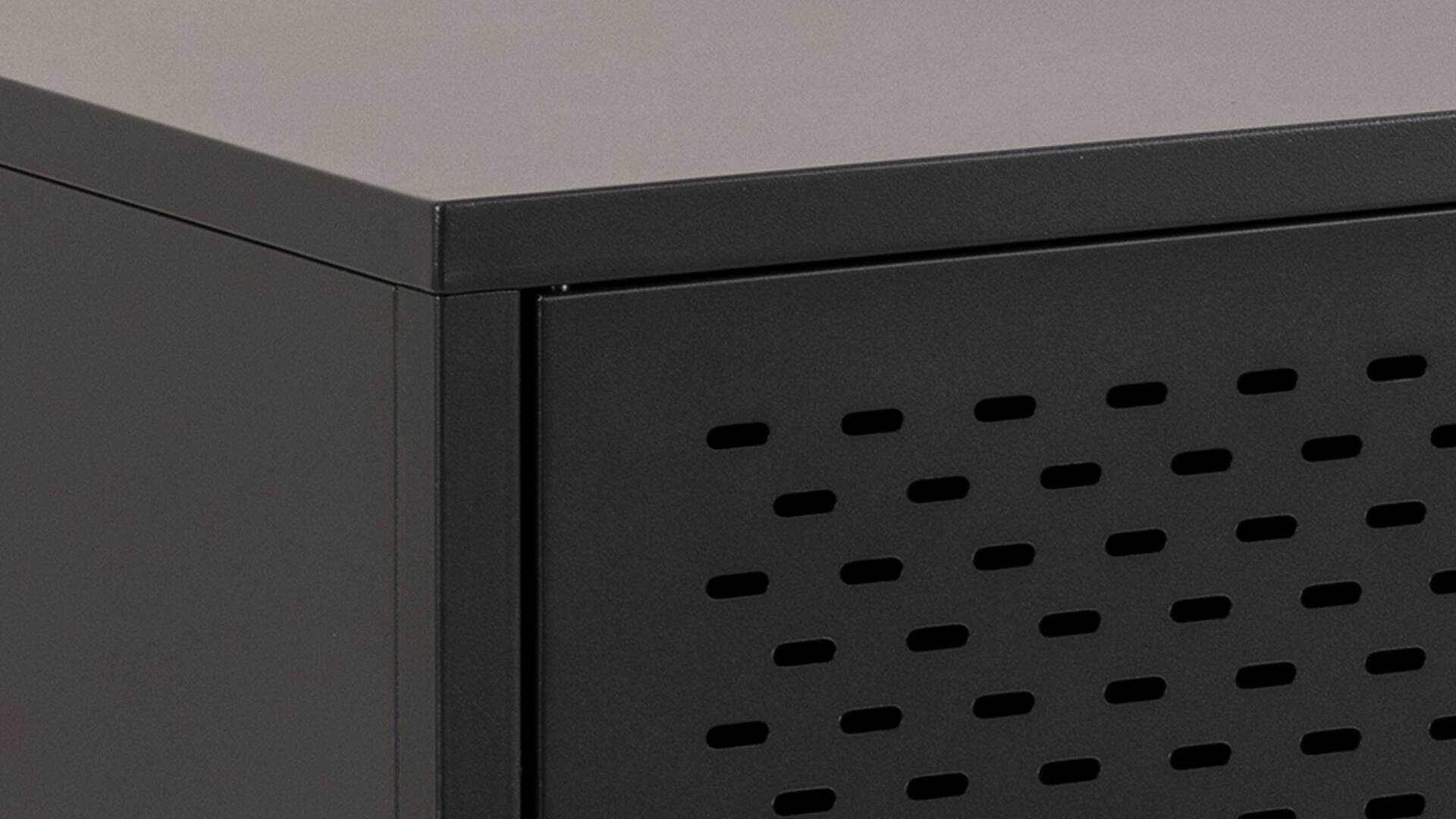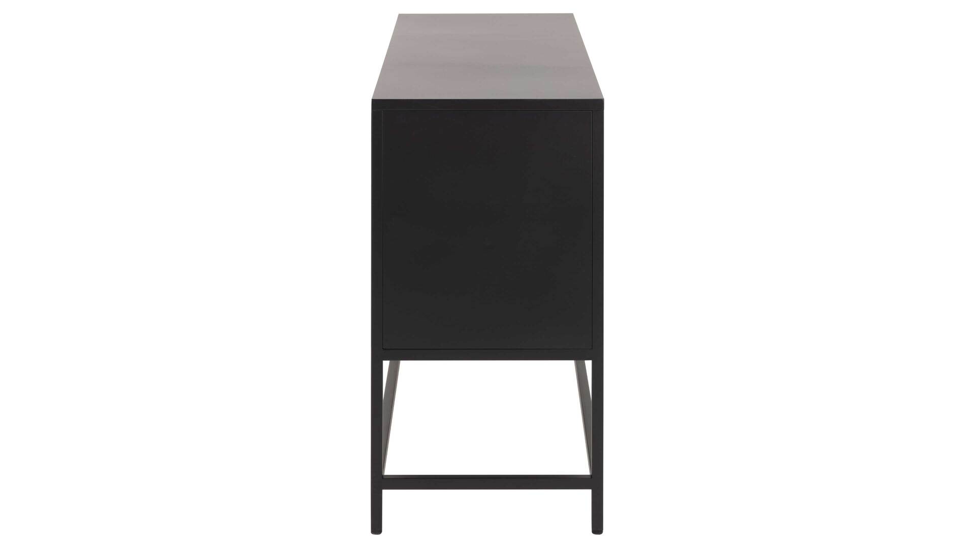 Dieses Sideboard ist im modern interpretierten Industriestil designt. Damit verströmt es spezielles Flair und zieht die Blicke auf sich. Die außergewöhnlich gestaltete Kommode besteht aus mattschwarz pulverbeschichtetem Metall mit rauer Oberfläche. Durch das erstklassige Material und die hochwertige Verarbeitung ist sie enorm robust und langlebig.