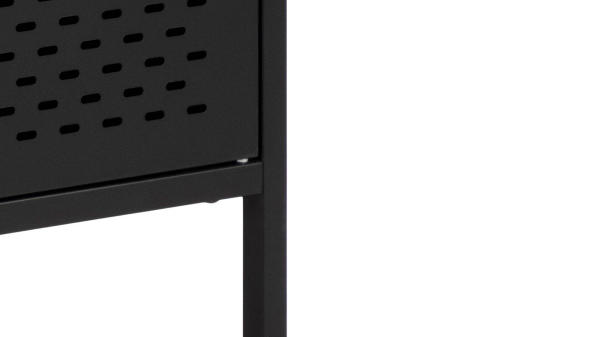 Hinter den drei Türen mit gelochten Fronten beherbergt die Metallkommode zwei Metallböden. Ihre Maße belaufen sich auf ca. 125 x 75 x 40 cm (BxHxT). Demnach bietet sie Ihnen jede Menge Stauraum für verschiedene Gegenstände, etwa DVDs, Blu-ray, CDs oder Fotoalben. Und auf dem Oberboden kommt Dekoratives schön zur Geltung. Die Türenkommode ist insgesamt bis maximal 33 kg belastbar. Praktisch sind zudem die Plastik-Fußkappen zum Schutz des Fußbodens.