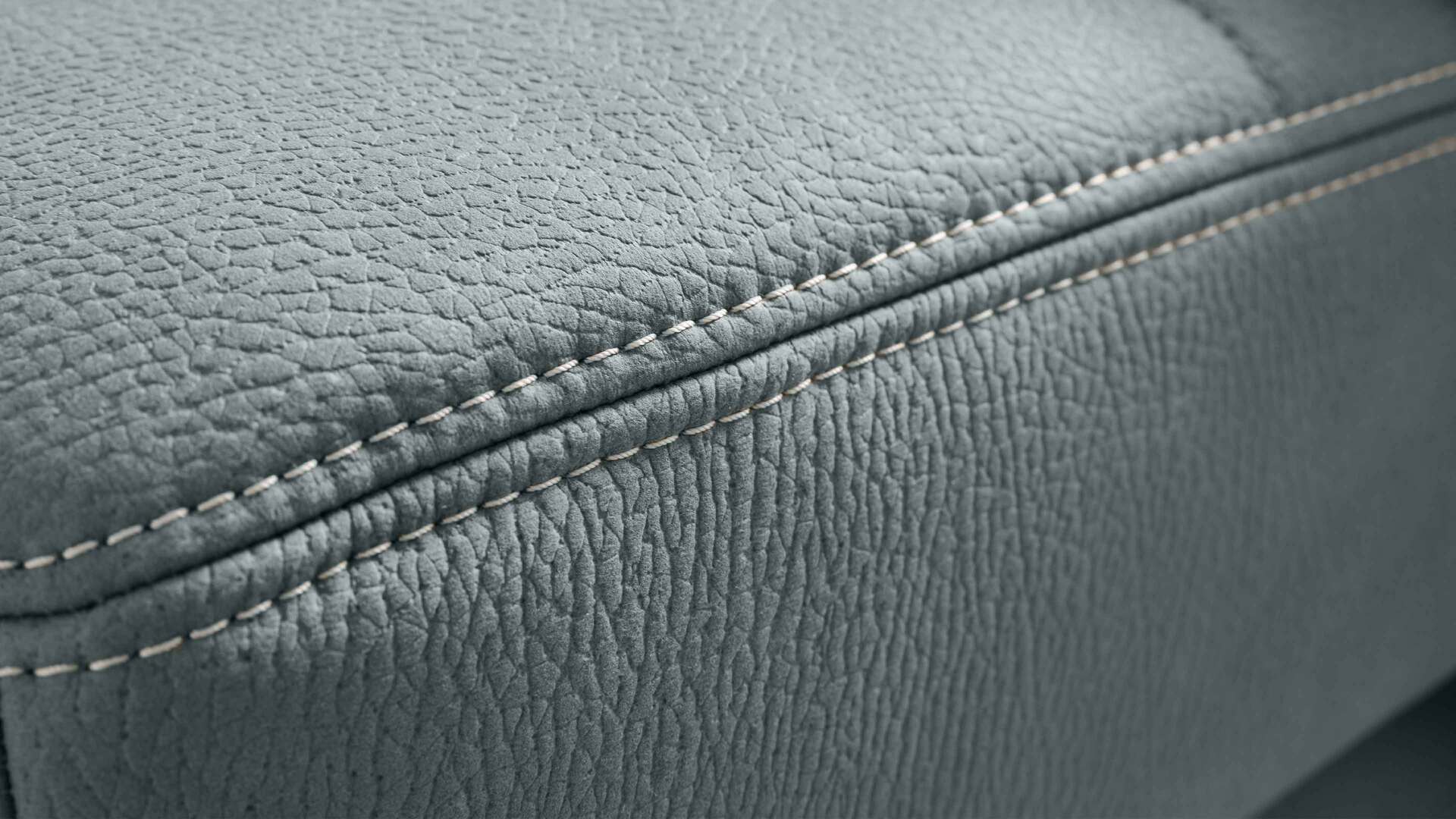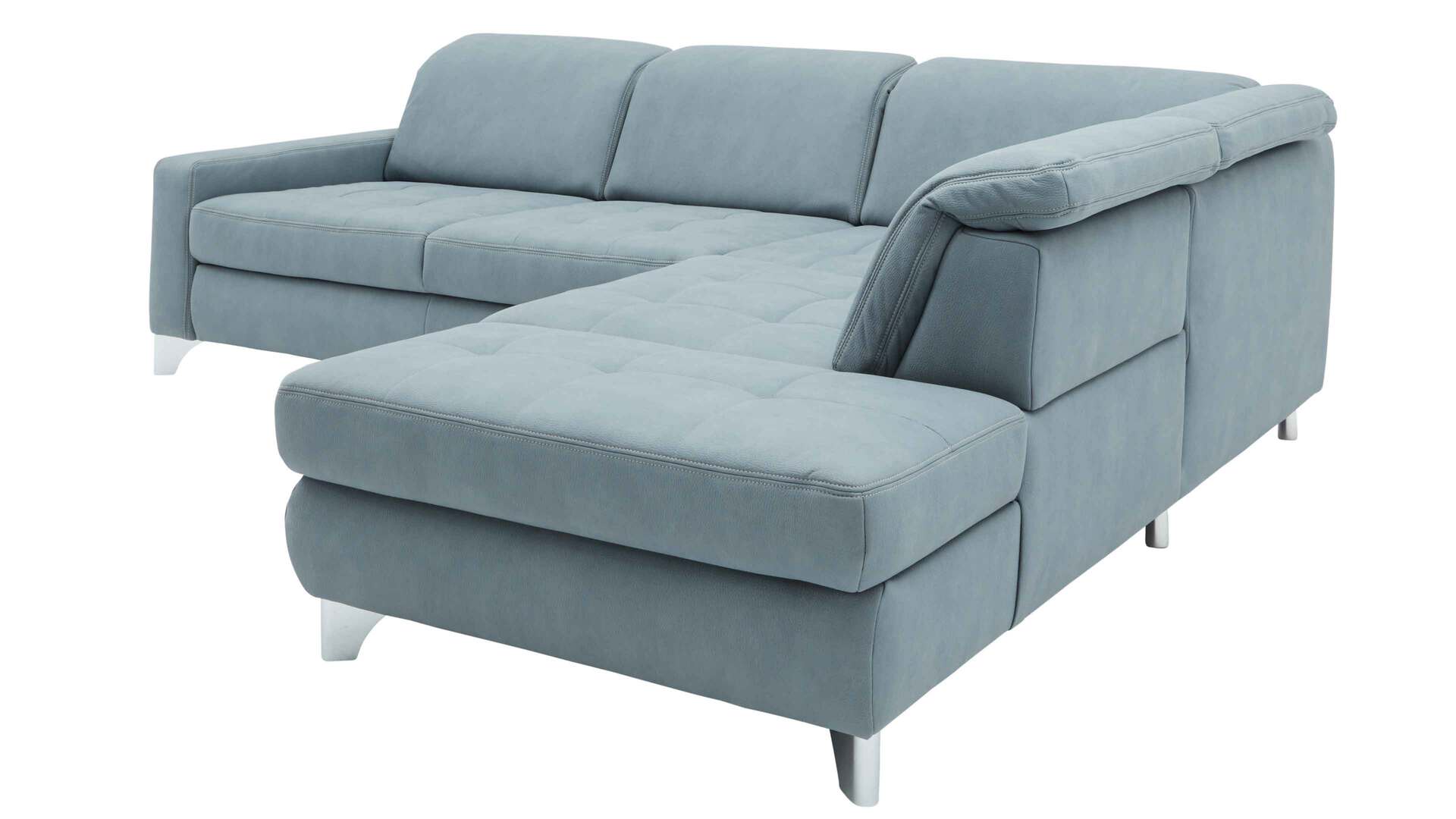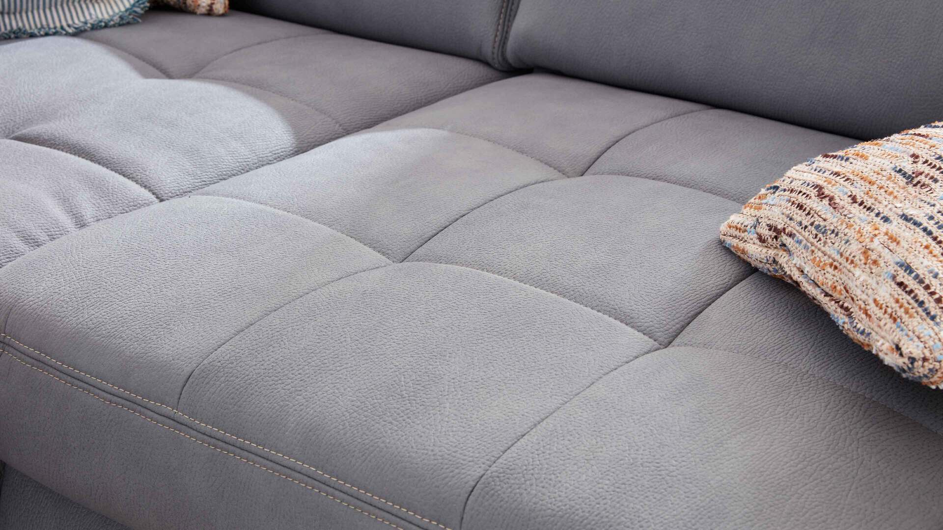 Durch die schlichten Farben fügt es sich in verschiedene Einrichtungen absolut stimmig ein. Als visuelles Highlight fungiert der helle, stahlfarbene Mikrofaserbezug, dessen genarbte, lederähnliche Optik ebenso einen edlen Akzent setzt wie die beige Kontrastnaht. Die glänzenden Metall-Winkelfüße runden das trendige Design stilsicher ab. Da auch die Rückseiten stoffbezogen sind, können Sie die Couch frei im Raum platzieren.