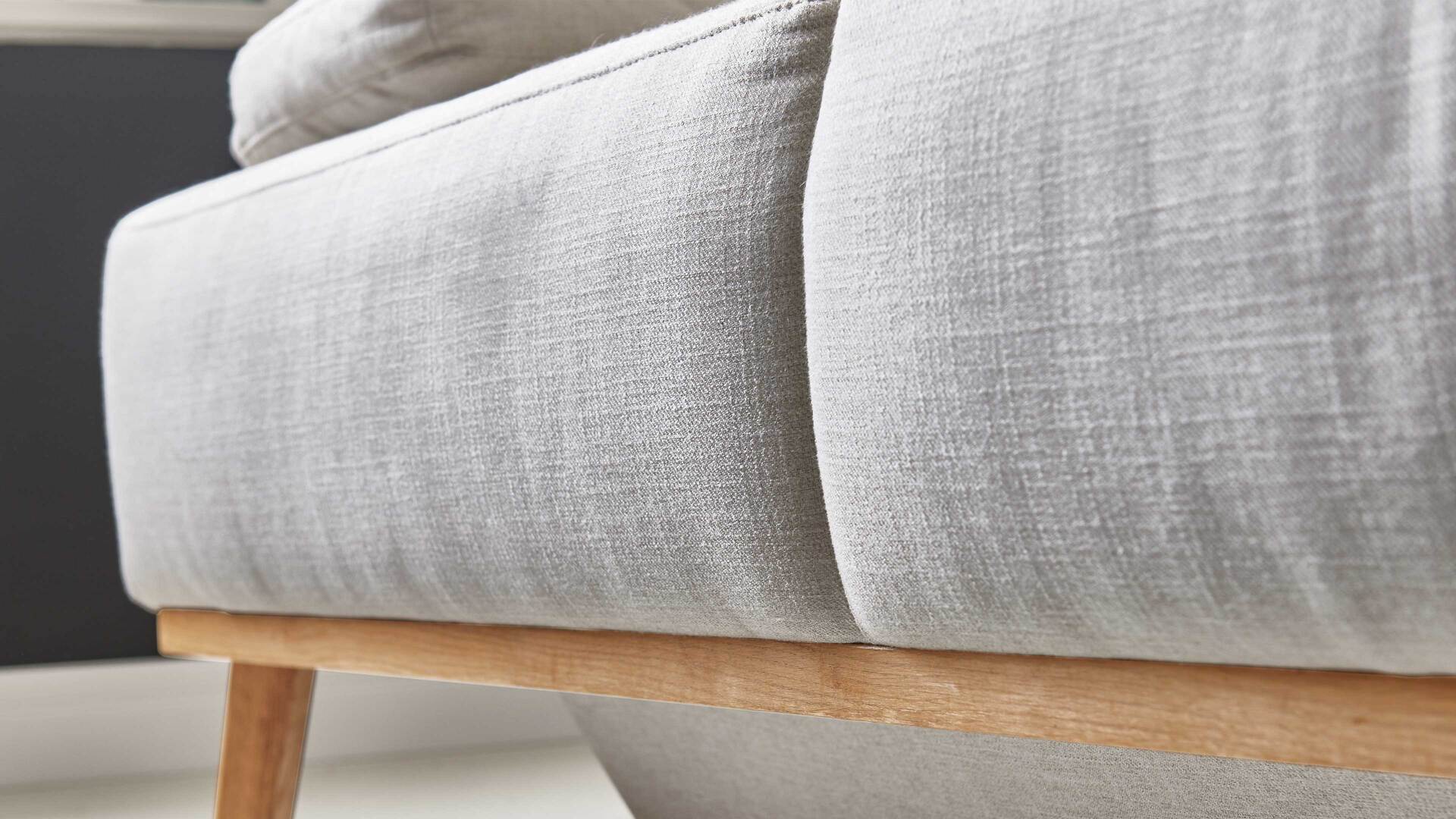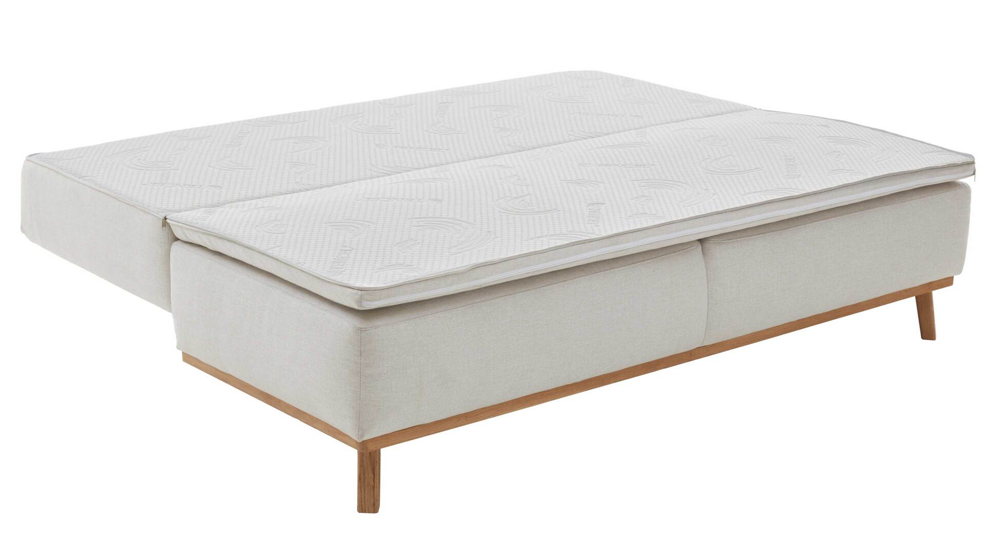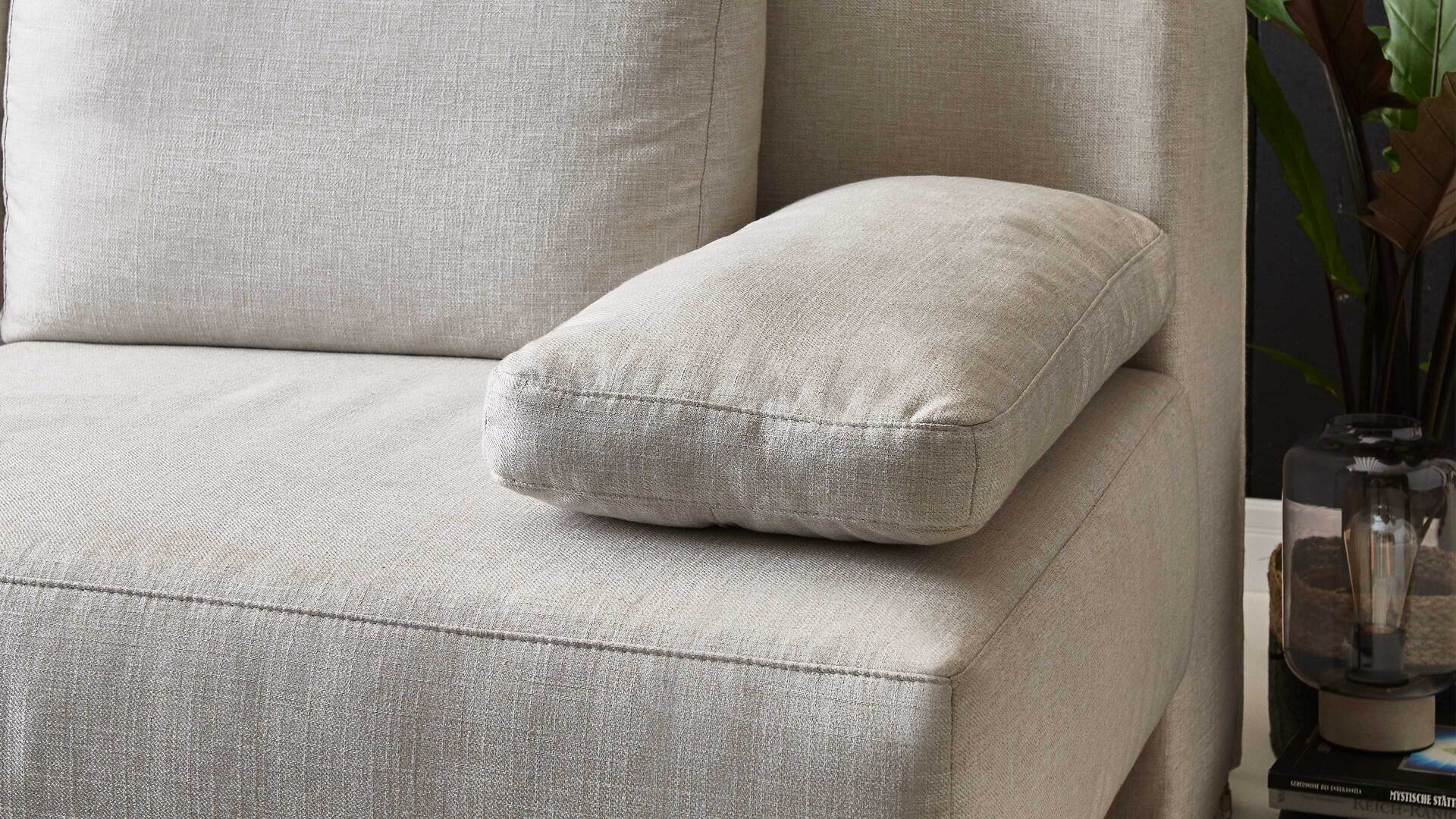 Das Sofa kommt in einem dezenten Naturton und passt somit zu einer Vielzahl an Nuancen des Interieurs. Sein naturfarbener Stoffbezug ist besonders weich im Griff. Die zugehörigen losen Arm- und Rückenkissen sind im gleichen Farbton gehalten und mit einer soften Flockenfüllung ausgestattet. Für noch mehr sanften Komfort sorgt der darunterliegende Federkern mit Polyschaum und Wattevlies auf Wellenfedern in Sitz und Rücken. Der Rückenteil ist mit einer Polyschaum-Wendematratze versehen - gegen Mehrpreis auch mit Kaltschaummatratze. Hinzu kommt ein praktischer Reißverschluss in Sitz und Rücken.