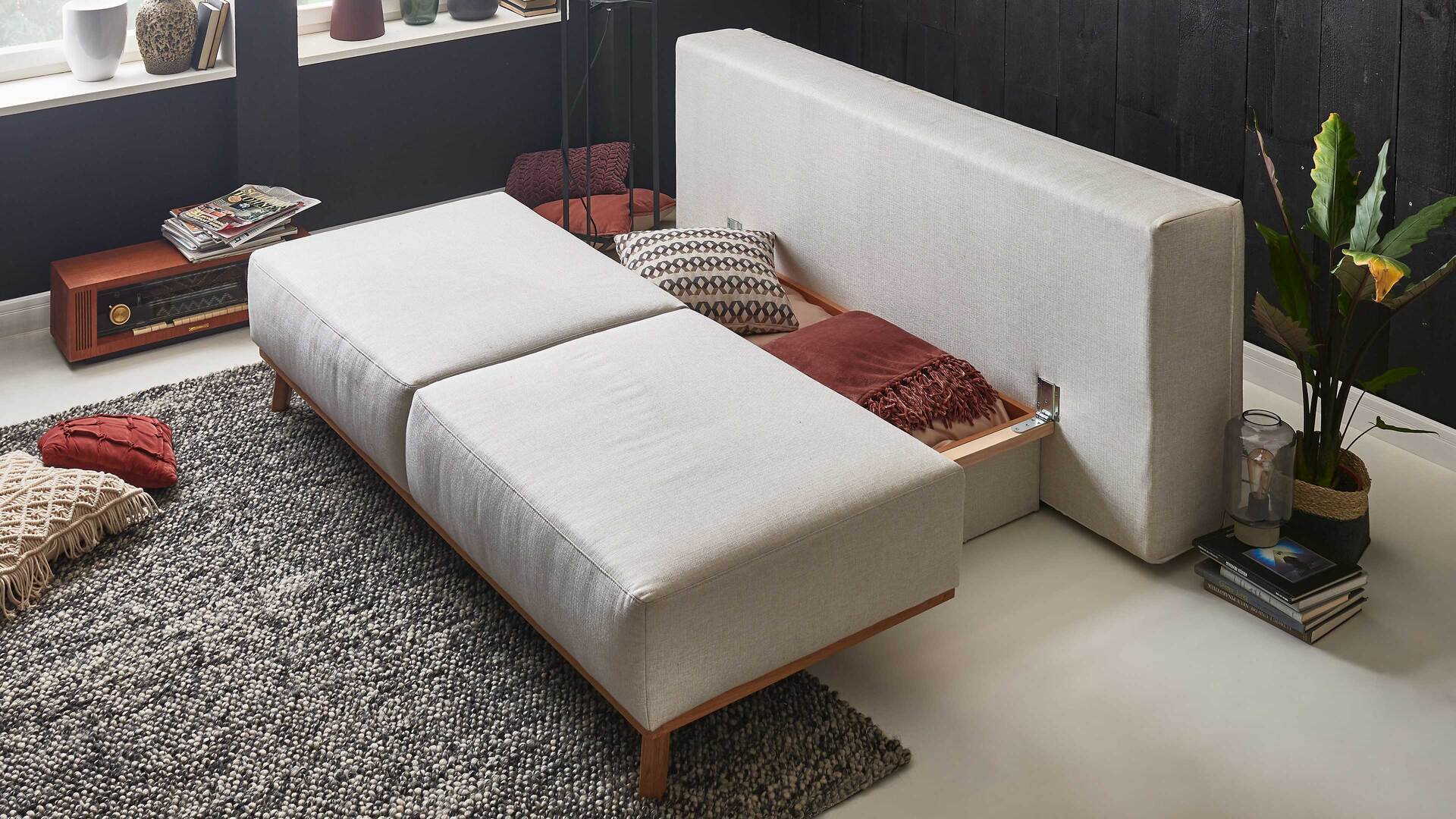 Formschön und kompakt passt das Schlafsofa Patti in jedes Wohn- oder Schlafzimmer. Selbst wer auf eher engem Raum lebt, kann mit dem multifunktionalen Möbelstück bequem Platz sparen - ohne Verzicht auf ein Höchstmaß an optischer Raffinesse. Der geräumige, weiß beschichtete Bettkasten eröffnet zusätzlichen Stauraum. Auch als moderne Ausstattung für den Gästebereich macht das vielseitige Funktionssofa eine gute Figur.
