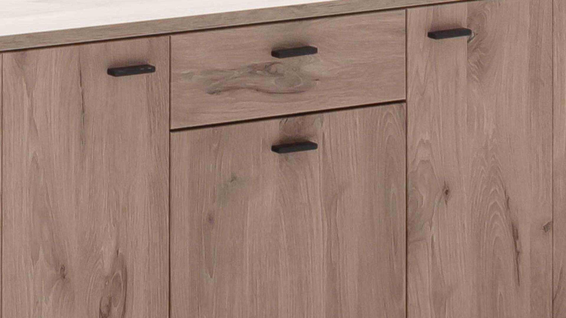 Das Sideboard aus dem hochwertigen Wohnprogramm Prato bringt modern interpretierte Natürlichkeit in Ihr Wohnzimmer. Durch die authentische Viking-Oak-Nachbildung strahlt die Kommode Wärme und Gemütlichkeit aus - genau das, was man sich im wichtigsten Raum des Zuhauses wünscht. Schlichte schwarzgraue Metallgriffe runden den attraktiv designten Kommodenschrank stimmig ab.