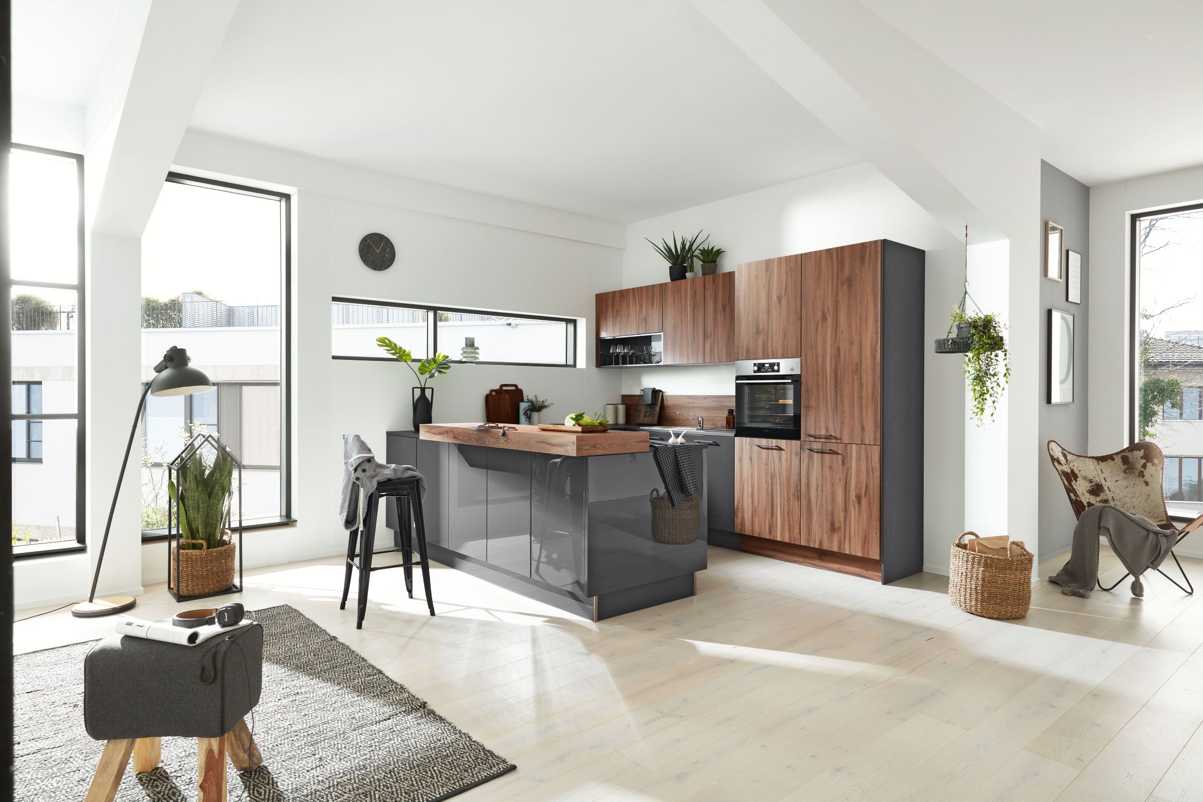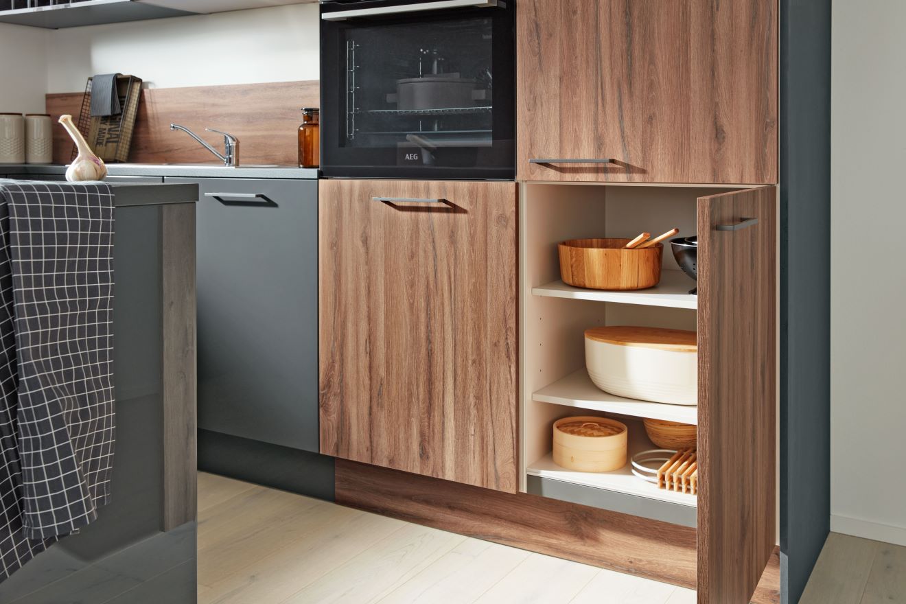 Die Schönheit der Designküche Interliving Nova Lack! Mit ihrem atemberaubenden Design in Grau und Naturholz, kombiniert mit einer eleganten Arbeitsplatte in mattem Anthrazit, ist diese Küche ein echter Hingucker. Aber es geht nicht nur um das Aussehen - die Interliving Nova Lack Küche bietet auch eine hohe Funktionalität und Langlebigkeit. Optimieren Sie Ihre Küche und verbessern Sie Ihre Koch- und Esserlebnisse mit der Interliving Nova Lack Küche.