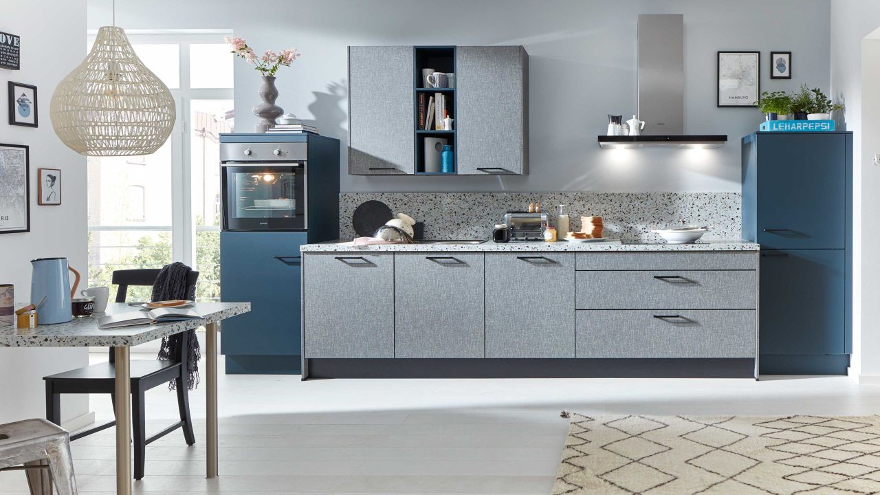 Die WERT-KÜCHE Sina ist Made in Germany und kombiniert samtmatte tiefblaue Fronten, Sichtseiten und Sockelblenden mit Torino grauen Frontbereichen sowie einem Korpus und Bügelgriffen in Onyxschwarz. Akzente setzen die Arbeitsplatten, der Ansetztisch und die Nischenverkleidung in Terrazzo Urbano. Durch die Farben strahlt die ca. 433 cm lange Küchenzeile moderne Extravaganz aus. Der Ansetztisch misst ca. 80 x 120 cm (BxL). Dank der Vielzahl an Schränken, Auszügen und offenen Fächern bietet der Küchenblock jede Menge Stauraum für Geschirr, Küchengeräte und Lebensmittel.
